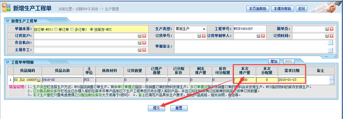 2、进入界面后,勾上“按库存”,选择需要排产的成品信息,录入数量和日期,提交完成。如下图所示: 点晴模切ERP更多信息:https://moqie.clicksun.cn,联系电话:4001861886 该文章在 2018/1/23 12:03:04 编辑过 |