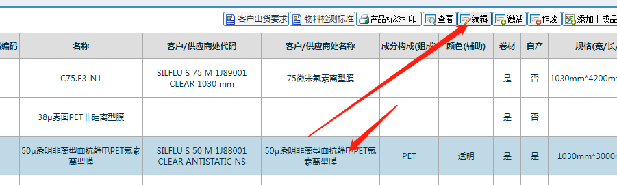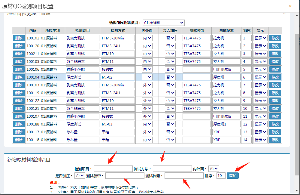 问:离型膜品检类型在哪添加? 进入界面后,点击“原材检测项目设置”按钮 进入界面后,录入新的检测组别,点击提交完成 回到基础资料界面,编辑,将对应的检测项目绑定到对应的原材料基础系统管理-物料管理-物料信息维护