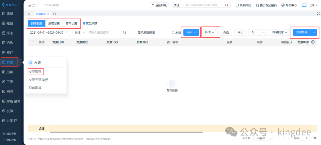 导入或新增好发票数据后,勾选需要生成凭证的发票,点击右上角的【生成凭证】按钮,就可以生成凭证啦