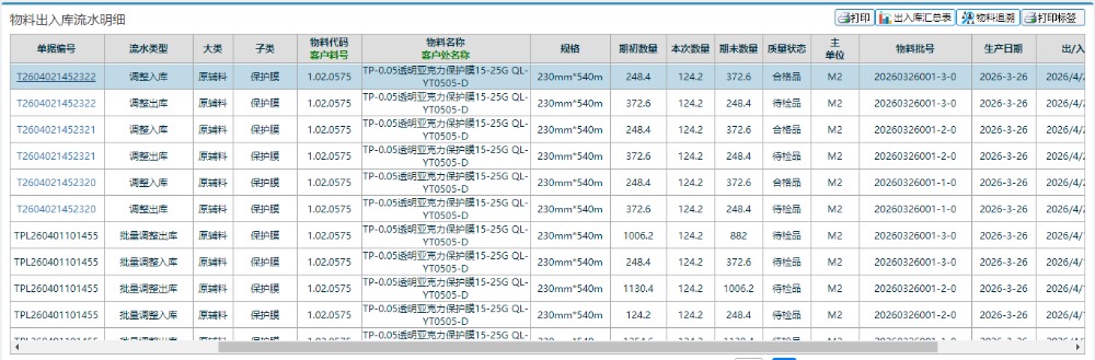 在系统找到“仓库管理” 》“物料流向管理” 》“物料出入库流水明细”页面进入查询。
