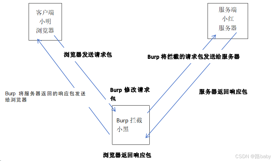 通信过程 1.浏览器建立与web服务器之间的连接 2.浏览器将请求数据打包(生成请求数据包)并发送到web服务器 3.web服务器将处理结果打包(生成响应数据包)并发送给浏览器 4.web服务器关闭连接 总结: 建立连接——>发送请求数据包——>返回响应数据包——>关闭连接 当加入Burp Suite时,客户端与服务器的交互过程如下: