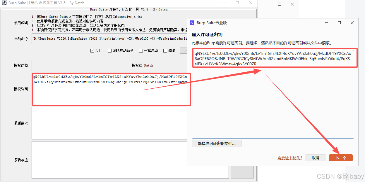 随后按照下图步骤将burp第二步给的秘钥粘贴进注册机 并将注册机生成的最后的秘钥粘贴进burp 按照下图步骤进行 然后点击下一个