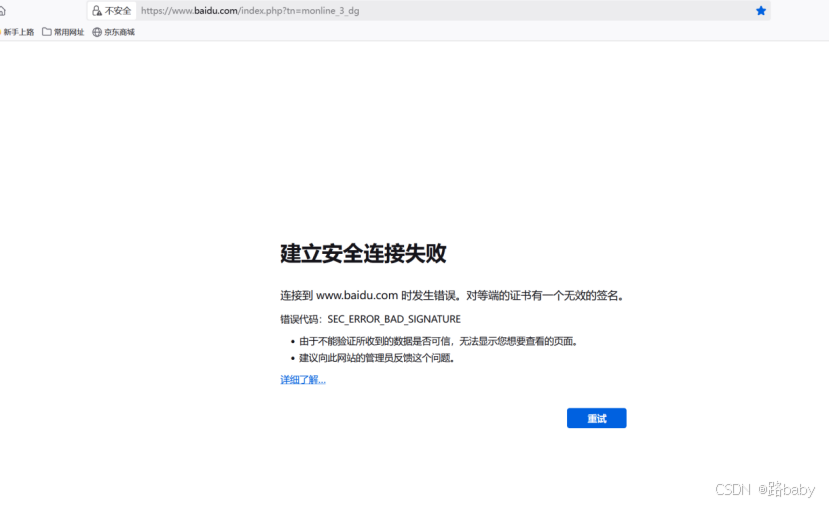 需要注意的是: Burp suite 默认是不会抓取 https 的数据包的,要抓取 https 的数据 包需要安装证书。 这时候我们去访问百度发现连接失败就是因为https