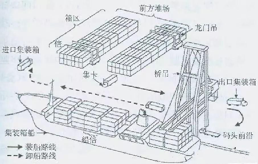 集装箱运输体系中,除了集装箱和集装箱船舶,集装箱码头也起了很重要的作用,同时码头也需要很多机械设备来配合作业。 01.码头布局集装箱码头最基础的两个功能就是将出口重箱输送出去,将进口空箱运进来。以下是简化版的装船路线和卸船路线。基本布局如下,不同数字代表不同的功能区:1.码头前沿:设有岸边集装箱起重机及其运行轨道。2...